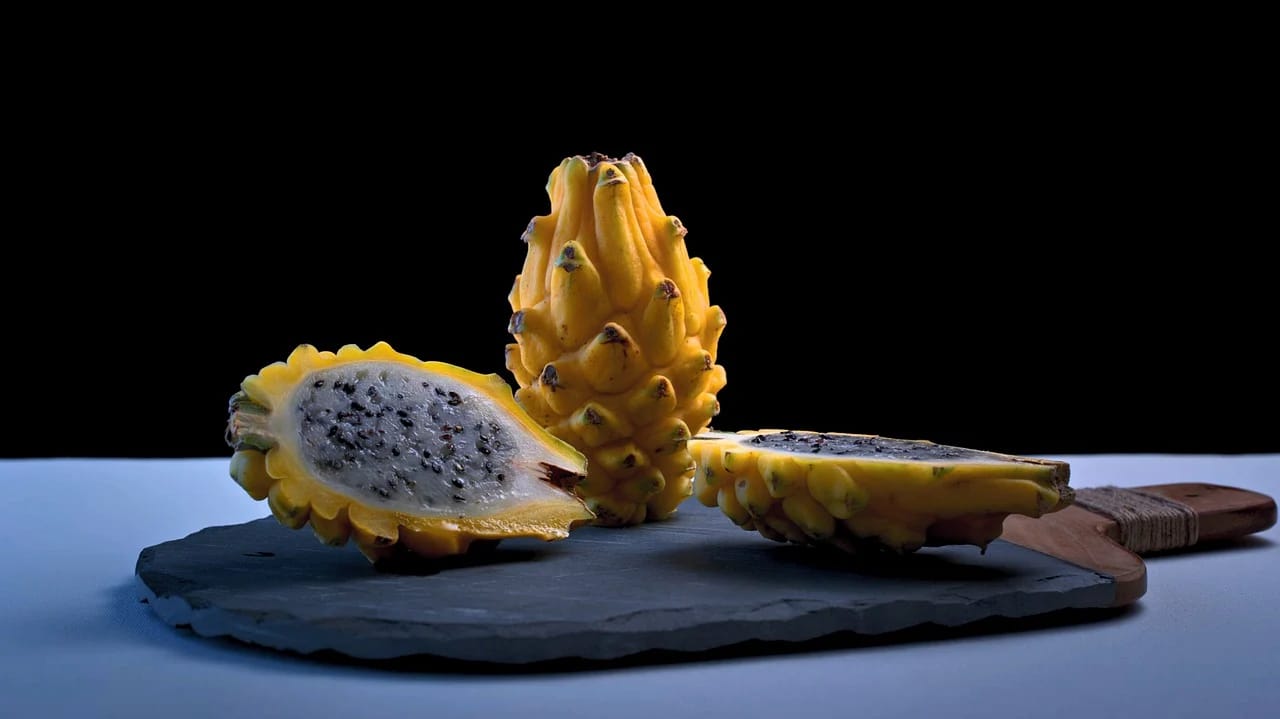 Golden dragon fruit is a variety of fruits characterized by its vibrant yellow skin and white or yellow flesh. Like all other species of Dragon fruits, the Golden dragon fruit is also dotted with tiny black seeds.